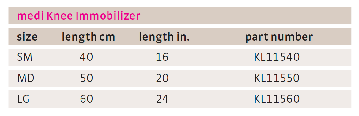 The Knee Immobilizer provides immobilization at 0 degrees. It has an open wrap, three panel design to make it easy to adjust as well as put on and take off. The rigid stays can be removed for easy customization.