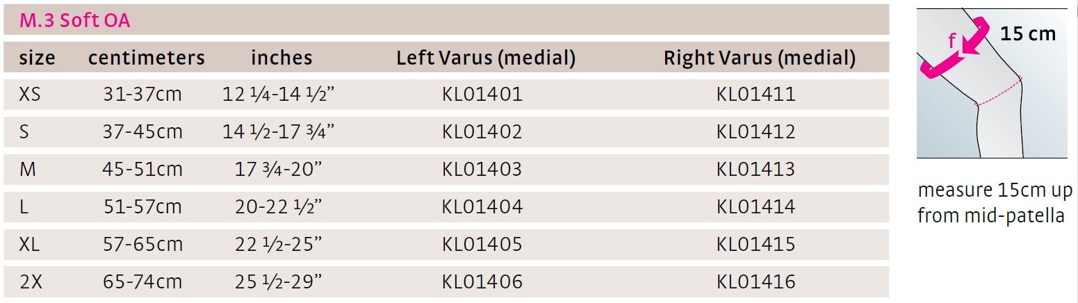 The M.3 Soft OA knee brace is a revolutionary design to ensure compliance and comfort for patients suffering from medial compartment OA. This brace has a low profile to easily fit under clothes. The unique Multi-Function hinge centers effective off-loading pressure exactly where it's needed and incoporates extenstion and flexion stops seamlessly into the design. The sleeve is crafted of Airtex spacer mesh fabric that breathes well, wicks moisture and stays in place. The five numbered straps are easy to adjust and fit and all have Y-connectors for trimming as needed.